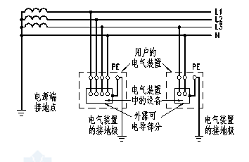 -由于電源系統有兩個獨立接地體,發生接地故障時接地故障電流較小,不能采用過電流保護兼作接地故障保護,而采用剩余電流保護器;
