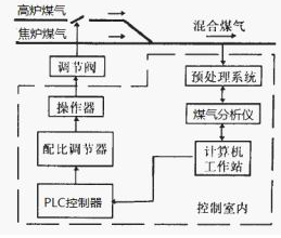 通過實踐,對煤氣站控制系統(tǒng)調(diào)整如下圖。預處理系統(tǒng)從混合煤氣管道取樣并對樣氣做除塵、除焦和脫水的處理,保證紅外煤氣分析儀的測試條件。紅外煤氣分析儀分析混合煤氣各組分成分并給出測量熱值。為保證混合煤氣熱值控制在一定值范圍內(nèi),混合煤氣實際測量值將引入比值調(diào)節(jié)系統(tǒng),用來對高焦比進行修正。調(diào)節(jié)指令通過計算機和PLC控制器來控制焦爐煤氣管道上調(diào)節(jié)閥的動作,以得到*終的混合煤氣熱值。