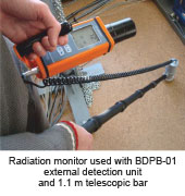 白俄羅斯ATOMTEX AT1125B 為一款輻射檢測儀,用于測量γ輻射劑量及劑量率,外接探頭BDPB-01與主機連接后,還可測量β表面沾污及放射性核素的活度。該款輻射檢測儀能夠用于搜查放射源、檢測廢金屬等。儀器內置 NaI(TI)閃爍體探測器,可快速*地對較小的輻射改變做出響應。 此外,儀器的校正功能(能量范圍 0.05...3MeV),使得儀器的劑量率測量更加*。BDPB-01 帶有 1.7m 延長桿, 使得測量非常方便。